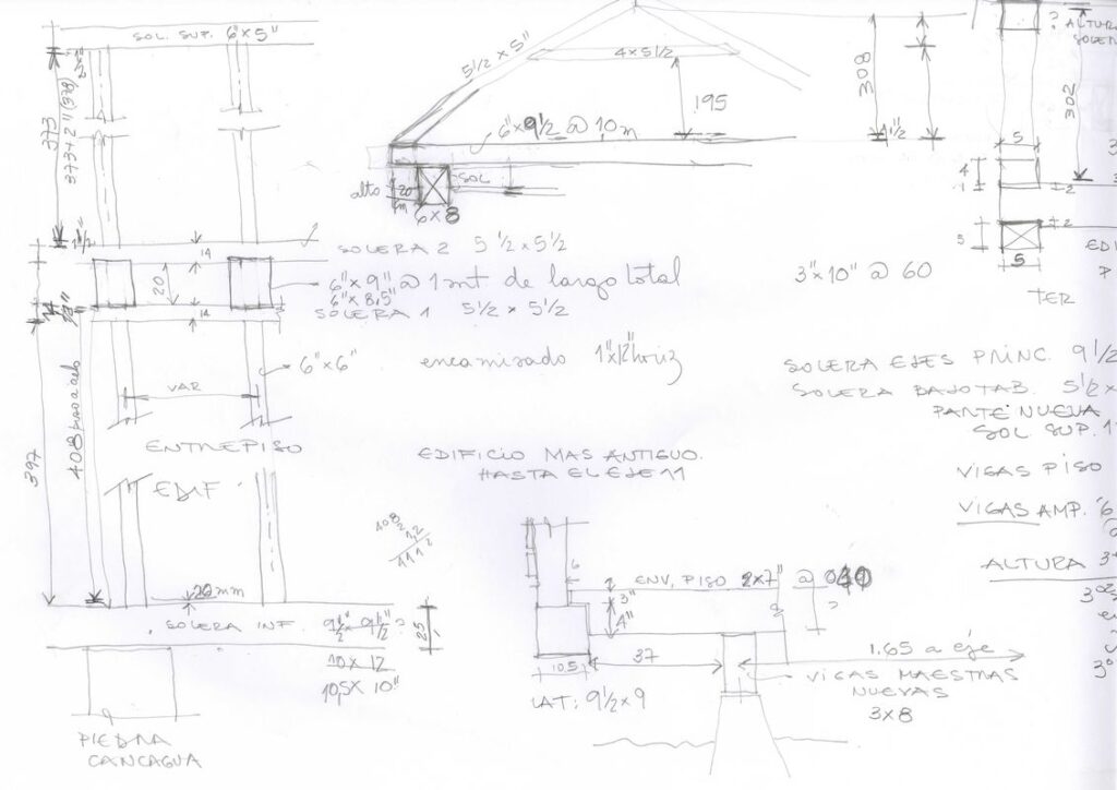 Formulación de plan de intervención en fachada de inmueble de conservación histórica. Los estudios previos comenzaron con un levantamiento crítico enfocado en la fachada, en el que se identificaron lesiones, poniendo énfasis en las deformaciones por hundimiento. En este diseño también se hicieron destapes, para recabar antecedentes del estado de conservación de la estructura.